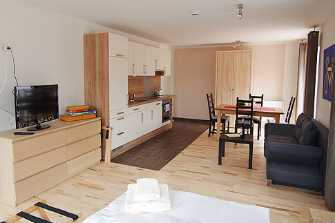 Die komfortable 40 m²-Wohnung ist optimal für 2 Personen ausgelegt, bietet aber auch bis zu 4 Personen eine wunderbare Wohnqualität. Die großzügige Einraumwohnung ist mit einem Flachbild TV und freiem WLAN ausgestattet. Die komplett ausgestattete Wohnküche mit Ceranfeld, Backofen, Kaffeemaschine, Toaster und Spülmaschine lässt keine Wünsche offen. Hier können Sie ihr eigenes Frühstück zubereiten oder abends gemeinsam kochen. Hieran schließt sich direkt der Essbereich für bis zu 4 Personen an. Das Badezimmer mit Dusche und WC ist freundlich, modern eingerichtet.